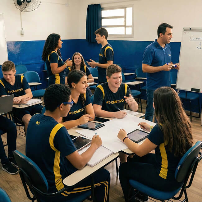 Com as aulas de Itinerário Formativo, os estudantes do Ensino Médio escolhem entre áreas de Exatas e Humanas, aprofundando conhecimentos conforme seus interesses e objetivos. Essa metodologia amplia a autonomia e prepara os alunos para os desafios da vida acadêmica e profissional.