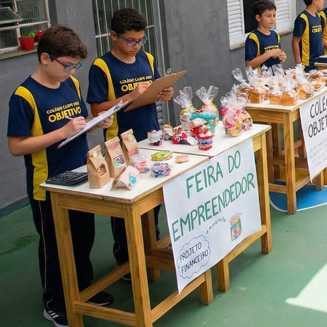 Os alunos realizam um projeto financeiro, compartilhando ideias e produzindo itens para venda, através do tema norteador do ano! Eles são responsáveis por organizar orçamentos, pontos de venda, abordagem de captação de clientes, e muito mais.